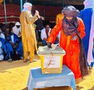 Ce samedi, l’atmosphère était solennelle dans ce petit village du département d’Aderbissinat situé en zone désertique. Peu après 10 heures (heure locale), la cérémonie s’ouvre par une Fatiha, suivie de l’exécution de l’hymne national avant le déroulement du vote et la proclamation des résultats. Sur 167 inscrits, tous ont voté, sans bulletin nul ni opposition, consacrant l’élection à l’unanimité d’Alhassan Attaher, l’unique candidat.
